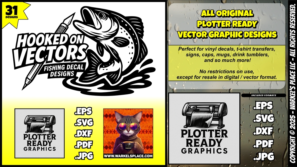 Hooked on Vectors: The Fishing Design Bundle - 31 Original Plotter-Ready Vector Graphics (EPS, SVG, DXF, JPG)